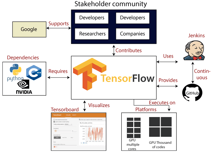 TensorFlow to otwartoźródłowa biblioteka programistyczna napisana przez Google Brain Team. Wykorzystywana jest głównie w uczeniu maszynowym i głębokich sieciach neuronowych. Została wydana 9 listopada 2015 roku. Biblioteka składa się z kilku modułów. W jej najniższej warstwie znajduje się rozproszony silnik wykonawczy, który w celu podniesienia wydajności został zaimplementowany w języku programowania C++. Nad nią znajdują się frontendy napisane w kilku językach programowania m.in. w Pythonie oraz C++. Powyżej umieszczona została warstwa API, która zapewnia prostszy interfejs dla powszechnie używanych warstw w modelach głębokiego uczenia. Na następną warstwę składają się wysokopoziomowe API, m.in. Keras oraz Estimator API, które ułatwiają tworzenie modeli i ich ocenę. Ponad tym znajdują się przygotowane przez twórców biblioteki gotowe do użycia